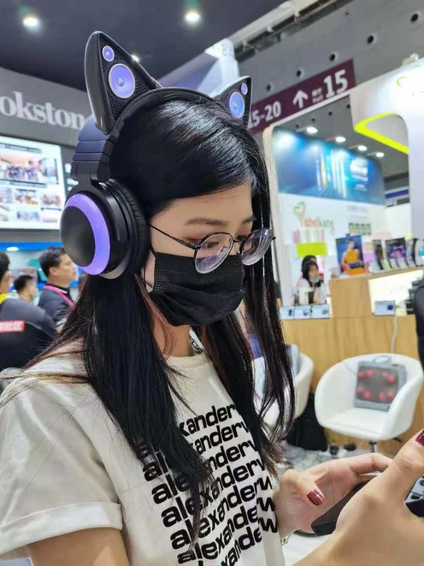 (參展游客現場試戴Brookstone2S貓耳耳機)