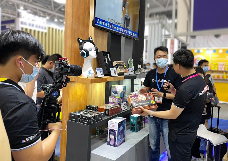 Brookstone展位火爆,主辦方“1688買家社區”也聞聲前來探店,現場采訪Brookstone負責人:“為何一個今年新進的品牌商會這么火爆現場?”Brookstone負責人向探店記者一一講述了買手必愛的Brookstone當家新奇好物,譬如獲得美國CES創新大獎的柔性傳感美顏自拍桿,還有獲得德國紅點設計獎的不銹鋼自動醒酒器等。