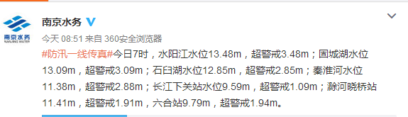 雨越下越大,南京的,江蘇的,全國各地的新聞都開始報道起各地洪訊災情。至今日9時,南京3處水位超歷史最高。