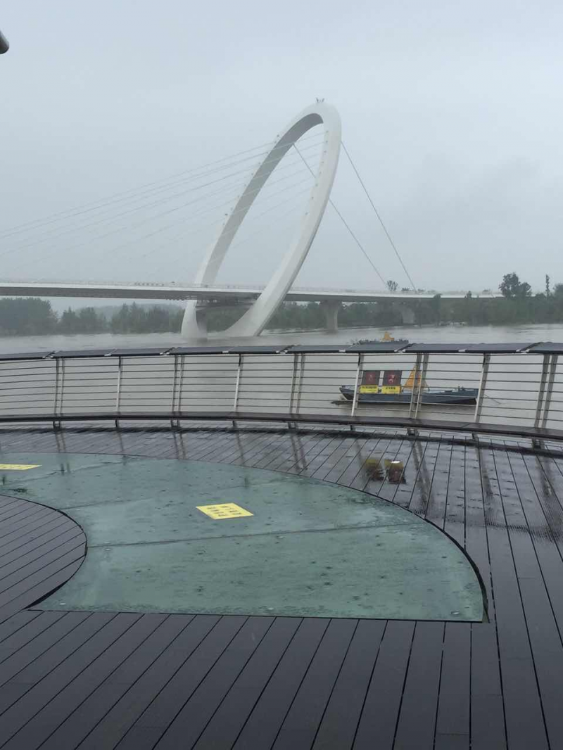 連續降雨讓長江南京段水位也升至高點。位于河西青年文化體育公園的親水步道基本都已經沒入江水中,南京眼的觀景臺已經快要被淹沒。